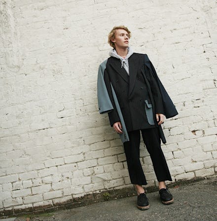 Condon, a keen observer of runway trends since his not too far-gone youth, says he first noticed the trend of elongated sleeves on the J.W. Anderson runway. He loved the aesthetic, but realized that desperately searching for one’s hands in swathes of fabric might prove cumbersome, so functionality became a key design motivation in transforming the seven suit jackets into one super-jacket.