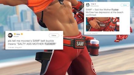 But wait, what’s that? His belt says “SAMF.” In his other skins, McCree’s belt says “BAMF,” which stands for “badass motherfucker.” But what the heck is “SAMF”?