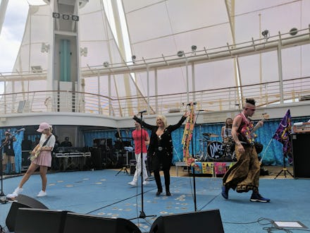 Around noon Eastern, the captain’s voice rang out on the P.A. system, informing passengers that the ship was getting close to the prime eclipse location. “We’ve never gone this way,” he said. “We usually go further south to the Caribbean.” Cruisers started flocking out of their rooms and into the outdoor theater, balconies, and other viewing spots for the big performance. Nick Weir, who oversees entertainment for the cruise company, introduced the show: “We’ve timed it so that as the moon touches the face of the sun, so effectively beginning the eclipse, she’s going to be singing her incredible world famous song, “Total Eclipse of the Heart.” DNCE performed an energetic set of their top hits, including “Cake by the Ocean,” “Naked” and “Toothbrush,” with a few nostalgic covers in the mix — TLC’s “No Scrubs,” Spice Girls’ “Wannabe” and Britney Spears’ “Oops, I Did It Again.” When Tyler came out, the crowd rose to their feet, singing along openly to her iconic track.
