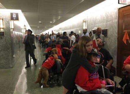 Protest organizers told Mic that at least 200 protesters — 80 of whom were using wheelchairs — showed up in the early hours of the morning to admonish Senate Republicans for their fifth attempt to repeal the Affordable Care Act with a bill that one estimate warned may kick more Americans off their health insurance than the so-called “skinny repeal,” which the Congressional Budget Office said would lead to 32 million people losing their insurance.