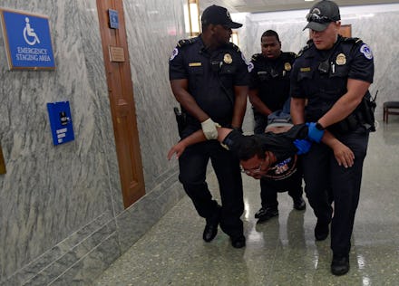Mass chaos ensued. In a hallway about four paces wide, protesters in wheelchairs locked themselves in place and were carried out of their devices by police officers. Chants of “No cuts to Medicaid” and “Health care is a human right” filled the halls. Screams of protesters saying Medicaid cuts would kill them echoed outside the hearing. Other demonstrators were handcuffed and dragged along the shiny stone floor frequently traveled by U.S. senators.