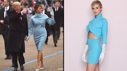 Of course this costume is not titled “Sexy Melania Trump” though, because that would be a step too far. Instead, it’s called “Model Wife,” with the costume itself a very obvious and close replica of the sky blue cashmere dress and jacket by Ralph Lauren that Melania Trump wore on Inauguration Day.