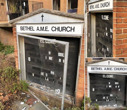 “The vandalism was limited to property damage including a broken stained glass window and broken or damaged exterior signs,” the statement reads. “The incidents are being treated as a possible bias crime; however, the investigation is currently active and no further information will be released at this time.”