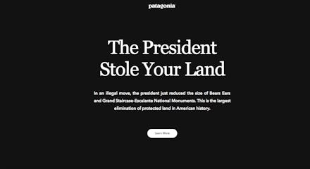 Hours after the announcement, outdoor brands were fighting back. Patagonia, most notably, launched a dramatic homepage that reads: “The president stole your land.”
