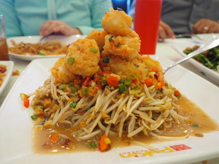 Camarón enchilado is popular throughout Chinese restaurants in Baja California. The shrimp is fried in breadcrumbs and flour and doused in a sauce with sugar, salt, chile de árbol, cornstarch and MSG, atop a pile of stir-fried bean sprouts, scallions and red and green bell peppers. White rice serves as a stand-in for corn tortillas, which are part of the traditional preparation. Mexicali is squarely in flour tortilla territory, but there are no tortillas to be found at Pekin.