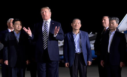 The three men flew back to the U.S. with Secretary of State Mike Pompeo, who traveled to North Korea to work out the details of a meeting between Trump and North Korean leader Kim Jong Un. Trump gave brief remarks upon the detainees’ arrival.