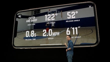 Apple showed off augmented reality apps as part of its Wednesday keynote. One such app was Homecourt, the basketball app that lets you analyze your game. Apple showed off how, using the iPhone’s camera, release time and release angle, users could track shot type, leg angle, speed and release height. The company also showed how users could play games in the world around them using their phone’s camera.