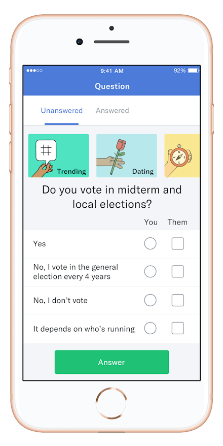 OkCupid saw a 64% uptick in political terms on user profiles following the 2016 presidential election and began to build features into the app to reflect their users’ interests. When setting up a profile on OkCupid, users have to answer at least 15 questions, which allows them to create their own algorithm and filter out profiles that don’t align with their interests.