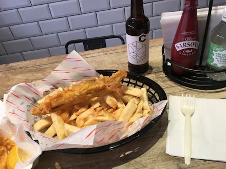Britain’s first vegan chip shop opened on Oct. 4, and its credentials are sound. Proprietor Daniel Sutton is a fishmonger who’s been operating fish and chip shops in North East London for 20 years. I already knew Sutton’s as a place that serves a really nice battered cod, and their chips are some of London’s finest. Curious to see if this expertise would translate to a vegan meal, I skipped past Sutton’s traditional fish-serving outlet in Hackney and entered the brand new vegan establishment, a few doors down on Graham Road.