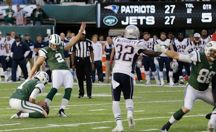 But a lone yellow penalty flag drifted into the frame that said otherwise. Officials doled out an unsportsmanlike conduct penalty to the Patriots' defensive tackle Chris Jones, whom they said pushed the back of his own teammate to gain unfair leverage in an attempt to desperately block the kick. Mind you, the kick wasn't even tipped — just badly pulled left. The Jets had a new set of downs, rushed the ball three times, brought Folk back in, and hit the locker rooms with an upset 30-27 victory.