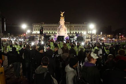 Protesters showed up at Buckingham Palace and at least two other monument sites in London sporting Guy Fawkes masks, which were most recently made famous from their appearance in the film. The Guy Fawkes masks are now synonymous with protesting, political change, and specifically the group Anonymous, an online collective of hackers, activists, and "hactivists."