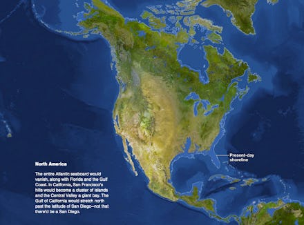 The new online maps shows the world's land masses as if ice no longer existed at the poles. Sea levels have risen 216 feet, whole habitats are gone, and entire chunks of continents are under water.