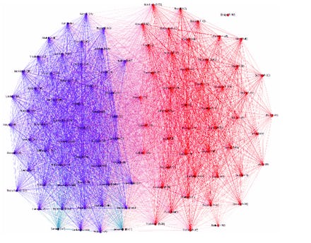 A line connecting two senators means that they have voted the same way on at least 100 instances. Republicans are highly connected to one another, and the same is true for Democrats. But as time progresses, it becomes increasingly rare that senators from different parties are voting together. Look how densely connected the Senate was in 1989 and 1990.