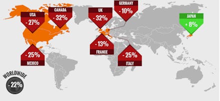 Nothing compares to New Year’s Eve 2012. The worldwide drop in traffic is a steep 28%, with porn viewing in the U.S. down 34%, Canada down 44%, and the United Kingdom down 48%. The crown goes to Argentina, though, which saw a staggering drop of 70% in porn watching on NYE 2012.