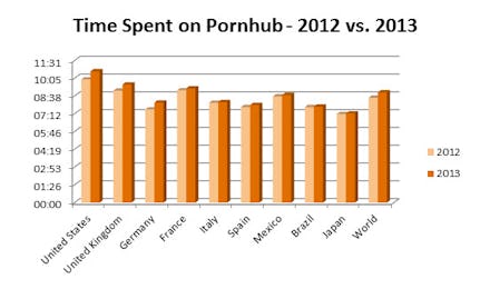 If the internet porn industry was worried about losing traffic any time soon, all it needs to do is look at Pornhub's 15 billion views, and this graph. The average time spent on the site during those 15 billion visits actually increased in 2013, by 26 seconds worldwide. The average visit was just shy of 9 minutes this year.