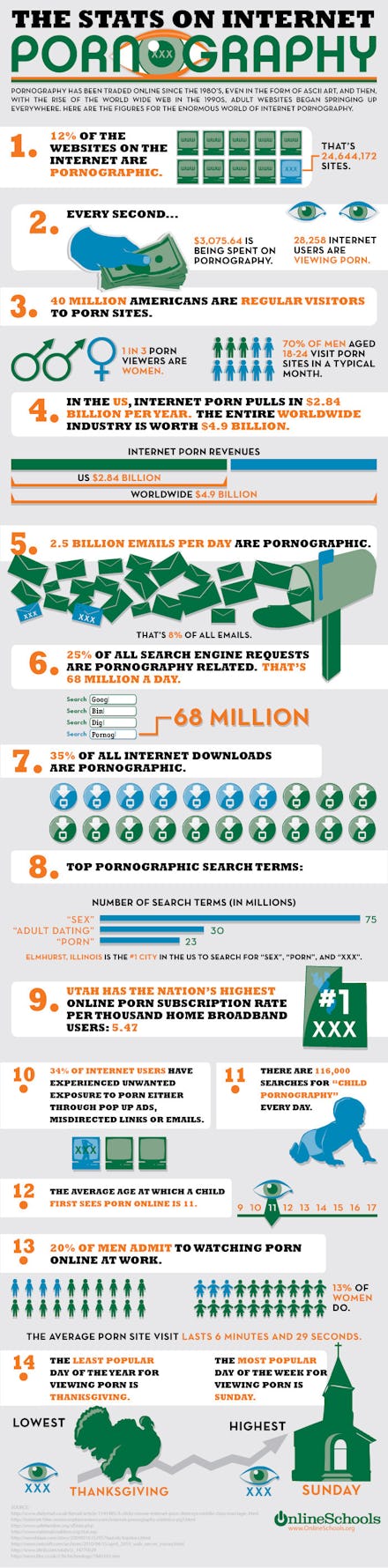 Porn is everywhere. Hardcore, softcore, all sorts of fetishes; there's almost no escaping it. Reports vary, but according to one study, 77% of Americans view pornography at least once a month. This infographic claims 40 million Americans (about 12% of the population) are regular visitors to porn sites and that 12% of websites (or roughly 26,644,172 sites) are pornographic. Take a look: