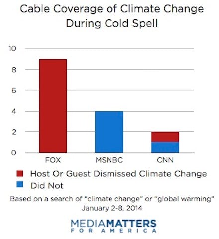Media matters looked at Fox News’ "coverage of cold weather from January 2 to January 8" and found that it "brought up climate change nine times, casting doubt on it every single time." According to Fox News, the deep cold brought by the polar vortex was evidence enough to disprove the idea of global warming. "Global warming?" they said. "But it’s so cold!"