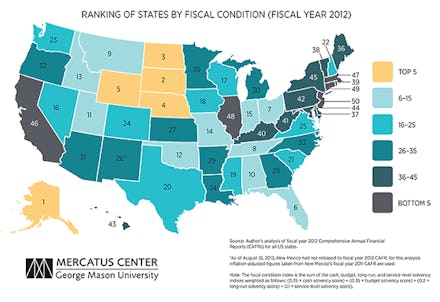 Takeaway: Although the Great Recession's effects are mostly waning, it's still difficult to get a real sense of where different states stand financially. Some factors hit certain states more than others, and some states were clearly able to recover more easily than others. As you can see in the map, states in the middle of the county tended to fare a little bit better than coastal ones, which represent some of the worst fiscal conditions in the country. Although the study was focused more on assessing the situation than solving it, knowing where we stand is half the battle, and hopefully this will give lawmakers and greater sense of the country's actual condition.