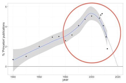 Alarming for any Princetonian. And if they weren't panicked yet, perhaps this search showing the declining scholarly research output of Princeton will do the trick: