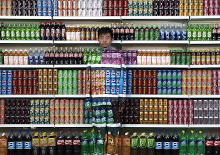 Here, Liu's assistants help him blend into a soft drink aisle at a supermarket. Entitled "Plasticizer," the work protests Chinese beverage companies' use of cancer–causing industrial plasticizers in their products.