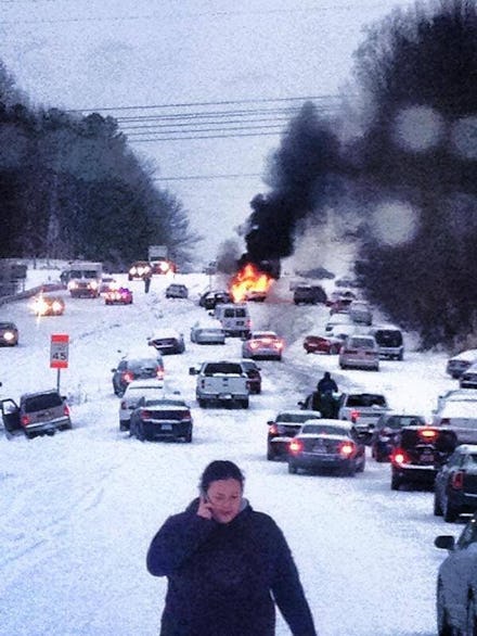 As POLITICO's Rebecca Burns pointed out, these snowy disasters following in the wake of what looks to people from higher latitudes like pretty mild snowfall are due to a unique confluence of factors, and "dumb Southerners don't know how to drive in snow" isn't one of them. When Atlanta roads were paralyzed by snowfall in late January, it was due to over 1 million Atlanta-area drivers hitting the road at once in an attempt to beat the snow. Local mass transportation like MARTA only serves the city and two adjacent counties (and improvements had been shot down in a 2012 referendum), so workers really had no alternative.