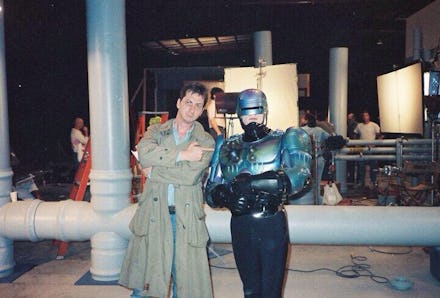 RoboCop 2 (1990) was a critical and commercial flop, a distinct downgrade from the outlandish violence and sharp satire of the first film. But few are aware that it also marked the screenwriting debut of legendary comic book author Frank Miller. This rare photo from 1989 shows the 32-year-old Miller on set with actor Peter Weller, in partial RoboCop gear: