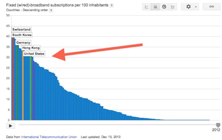 As PolicyMic previously reported, "[t]he World Economic Forum has ranked the U.S. (the inventor of the Internet) a pathetic 35th out of 148 countries worldwide in terms of broadband Internet bandwidth capacity" while we rank "58th out of 90 countries for cost of broadband." Now this graph from Google illustrates more of the same: