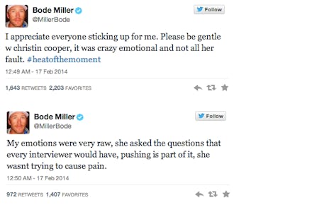 On Sunday, American alpine skier Bode Miller won the bronze medal at the men's super-G event, making him the most decorated American alpine skier and the oldest alpine skiing medalist in history. Shorty after the event, Miller was interviewed by NBC correspondent Christin Cooper, and as PolicyMic's Elieen Shim reported, things got kind of ugly quickly. Soon after, critics on Twitter lambasted Cooper, but Miller recently Tweeted out his own thoughts on the situation and defended the NBC analyst.