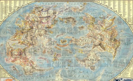 The northwest is covered with the new web — the ominous and growing empire of Google, flanked by social networks like Facebook, Linkedin, and Twitter. That area is also the sector of the web Vargic dumped online gaming and humor sites like 9gag, which are social endeavors. And across the sea lies the old world, controlled by tech giants like HP, Microsoft, and Cisco. Apple, to the southeast, has its own continent isolated by paywalls and app stores.
