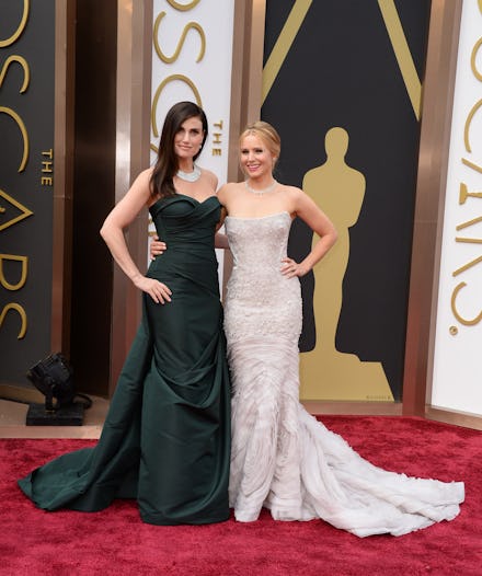 Frozen stars Idina Menzel and Kristen Bell got together for an adorable photo on the red carpet. Bell looked gorgeous in a white strapless gown, while Menzel rocked a dark green number.