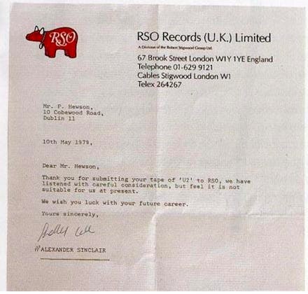 That year, Paul Hewson (aka Bono) wrote to RSO Records to inquire about a record contract. RSO was a good label, albeit one with an unfortunate logo (see below). In their day, they represented the Bee Gees, Eric Clapton and Andy Gibb. But they didn't want anything to do with U2, and sent "Mr. Hewson" this rejection letter: