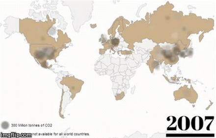 How does that look compared to the rest of the world? Surprisingly enough, the global landscape of carbon emission has not changed much over the years. Here's a GIF simulating CO2 output in 1971: