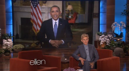 On Thursday President Obama appeared on Ellen as part of his recent media blitz to drive up health care enrollment, which now reportedly stands at 5 million. But as soon as they got through introductions, DeGeneres jumped straight into teasing the president. "I apologize for doing it, but I broke your retweet record," she said, as the audience cheered.