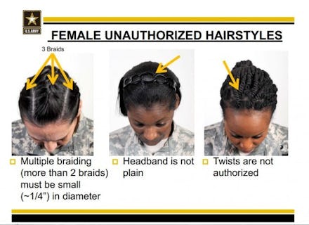 Jacobs, the sergeant who started the original White House petition, told the Army Times that she's "kind of at a loss now with what to do with my hair" and will probably have to start wearing a wig. She added, "Most black women, their hair doesn't grow straight down, it grows out. I'm disappointed to see the Army, rather than inform themselves on how black people wear their hair, they've white-washed it all."