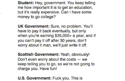 That about sums it up. There's a stark difference between the ways U.S. and UK students pay for college. In the UK, tuition costs are capped at a maximum of about $15,150, which doesn't need to be paid up front or until after graduation. If funded by English or Welsh funding bodies, students don't need to pay until they're earning over $35,350 and the amount owed is tailored to their income. Someone earning around $50,500 would pay $1,353 yearly for their loans. If it's not paid off in 30 years, it's written off entirely. Meanwhile, tuition in Scotland is entirely free for students who study in the home country.