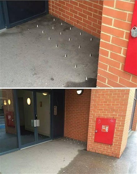 The news: It's common to see buildings with sharp spikes on the roof, designed to keep nesting birds away. But it's another thing entirely to see the same strategy applied to human beings.