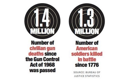 Still not working: As the above statistic illustrates, though, the country still has a way to go. (After all, it's not as if the country has been particularly averse to military action in the past few centuries.) There is good news — gun deaths are dropping, along with violent crime in general — but our gun control laws still allow things like this, and this, and this, and this, and all of this to happen. And that's just over the past week.
