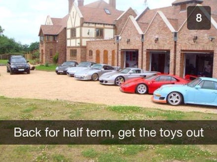 For a peek into the fantasy world of riches, privilege and British slang, look no further than the "richkidsnaps" Snapchat account and the associated Facebook community, "What Happens at Private School Goes On Snapchat," which has more than 248,000 likes. Here, users submit snaps of their obscene wealth while expressing distaste for "chavs," which those of us in the U.S. may need Wikipedia's help to understand.