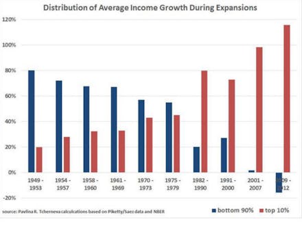 The graphic illustrates the distribution of average income growth during every period of economic expansion after World War II: