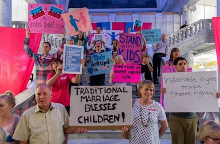 The Mormon-led community that congregated in the capitol's rotunda on Sept. 18 demanded that the ban remain in place in order to save and protect children, and held placards reading "Marriage means a mother and a father for every child," "A states' rights issue" and "Traditional marriage blesses children." Anderson, who attended the rally because he wants to be "on the right side of history," was not exactly embraced by the other protesters, with an old couple even telling him to "take [his] gay agenda and burn in hell."