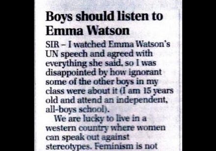 Love it or hate it, Watson's He for She speech is already making a discernible impact. Meet Ed Holtom of Hertfordshire, a 15-year-old U.K. boy who recently wrote an open letter challenging his peers to stop perpetuating nasty stereotypes and instead offer their support for gender equality.