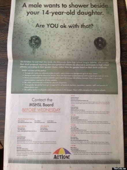 Much of the controversy centered a single-page ad, printed in the Minneapolis Star Tribune and taken out by anti-LGBT organization the Minnesota Child Protection League. In an effort to invoke outrage, readers of Minnesota's largest newspaper were accosted by this rhetorical question: "A male wants to shower next to your 14-year-old daughter. Are YOU okay with that?"