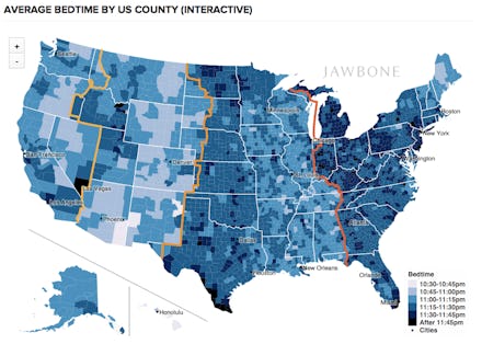 The findings? People living in cities just don't get enough sleep, ever. "No major city in the United States averages above the NIH-recommended seven hours of sleep per night," writes Jawbone data scientist Tyler Nolan. "But it's only part of the picture. The vast majority of the suburban and rural counties have much healthier sleep numbers."