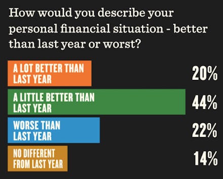 Gallup's latest report shows that 56% of all Americans think the economy is "getting worse," while only 40% see it improving, essentially unchanged from this time last year. Millennials, though, see their situation improving, with 64% reporting to Fusion that they are better-off today than 12 months ago.