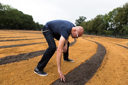 The portrait's intrigue stems partly from the different kinds of access it allows. It looks much different close up than it does from the sky — as NPR points out, it looks like a "field under construction" from ground level. When you look at it from above, however — either flying in a plane or visiting the Washington Monument — the face begins to take shape.