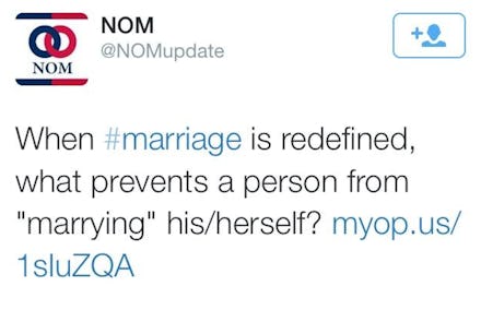Thankfully, the majority of people on the Internet seemed to have seen through this faulty logic, taking the moment to highlight the organization's unique breed of ignorance, lampooning the organization's wild assertion with the hashtag #WhenIMarryMyself.