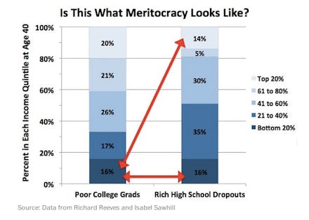In the graph below from the Washington Post, we see that that "Poor College Grads" and "Rich High School Dropouts" are likely to end up earning the same amount as they enter middle age: