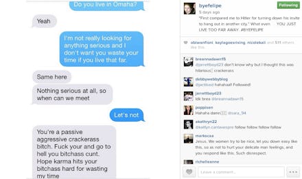 The harsh irony is that, in theory, online dating could create a safer space for women to encounter men on an even playing field, allowing them to screen unsolicited advances and interact with the opposite sex on their own terms. But as evidenced time and again, most recently by Bye Felipe, online dating also draws out the worst kinds of misogynistic behavior, exposing men's abusive treatment of women in one unmistakable screenshot after another.
