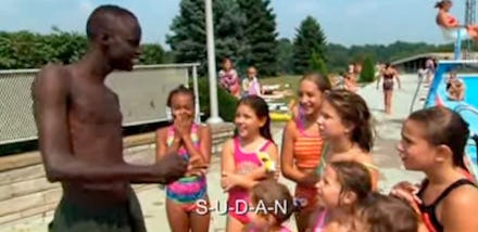"S-u-d-a-n," a Sudanese refugee immigrant to the United States tells a group of giggling girls at a local pool in the 2011 video "Culture Shock, Sudanese Refugees Coming to America."