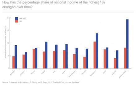 As Al Jazeera America notes, income inequality has rapidly risen in the ranks for the WEF's "Outlook" in recent years. In 2011, it was "the most underestimated" global trend, and last year it was considered the second most important issue for the global community to tackle. In language echoing leftist rhetoric on wealth distribution, the report showcases charts that highlight the increasing share of wealth in the hands of the 1%:
